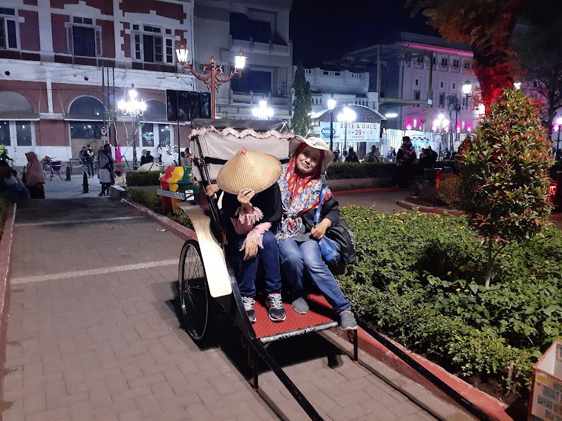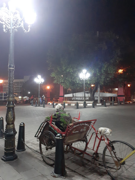 Dekat salah satu tiang lampu jalanan, kami temukan pak tua tukang becak sedang duduk di kendaraan tradisional ini. Mungkin dia juga sedang menikmati lampu-lampu di jembatan Berok petang ini seperti juga kami.