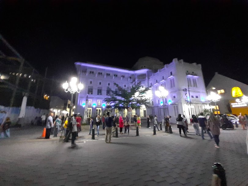 Malam itu suasana hangat, bahkan padat, banyak sekali orang menyusuri kawasan kota Lama Semarang, sampai kalau jalan di trotoar tepi jalannya kadang harus mencari ruang untuk menelisip-nelisip supaya bisa lewat. Agak sulit memotret jarak dekat karena banyak orang. Jadi lebih banyak mengambil foto dengan lensa lebar alias jarak jauh.