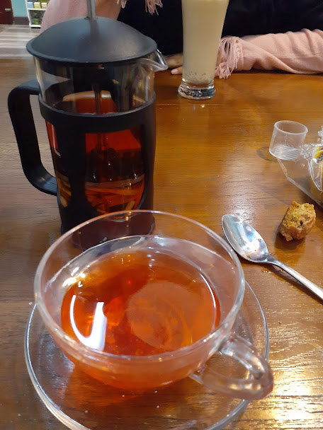 Setelah sekitar satu jam bersepeda, kami kembali berjalan kaki dan menikmati suasana. Lalu mampir di salah satu kafe di kota Lama Semarang, dalam Galeri Kreatif. Aku memesan wedang uwuh, anak lanang capuccino dan anak perempuanku memesan juice.